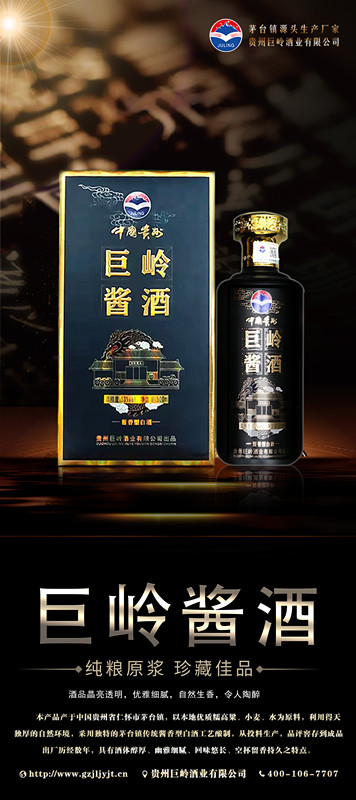 贵州巨岭酒业有限公司,座落于闻名世界的古镇,国酒之乡“茅台镇”。与“国酒茅台”共享得天独厚的气候、土壤、水源、以及微生物群等自然资源;《巨岭酒业》老作坊前身“巨岭烧坊”,经过多年的传承,秉承先辈们代代相传的古法酿造工艺,历经几代人的延续和酿酒发展,奠定了《巨岭酒业》发展的坚实基础。